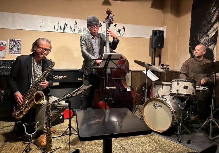 「柳原たつおトリオ」岩佐真帆呂(ts,ss) 柳原たつお(b) ヨシダシンゴ(ds)